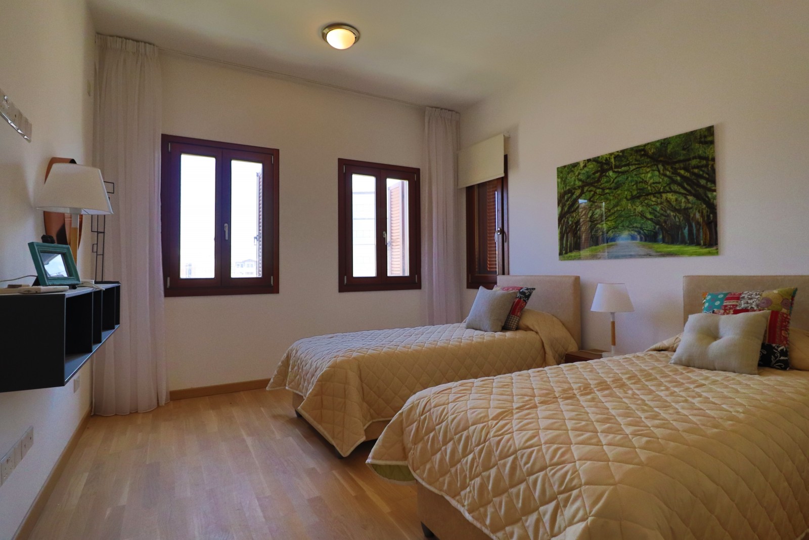 To the right, you’ll find the master suite, complete with fully fitted luxury wardrobes and a sumptuous en-suite bathroom. On the left is the guest twin bedroom, also with fitted wardrobes and a luxury en-suite. Additionally, there is a convenient guest cloakroom.